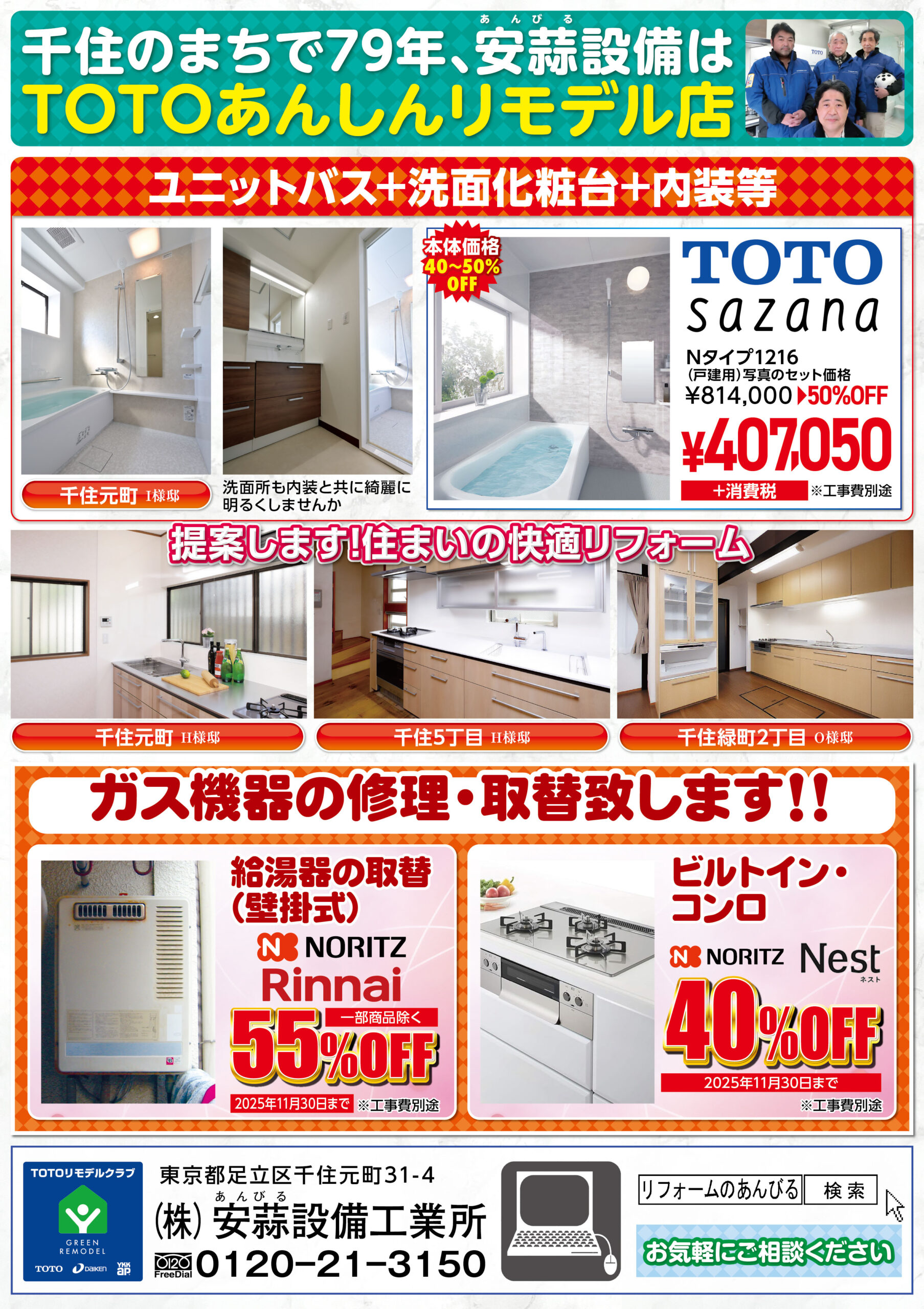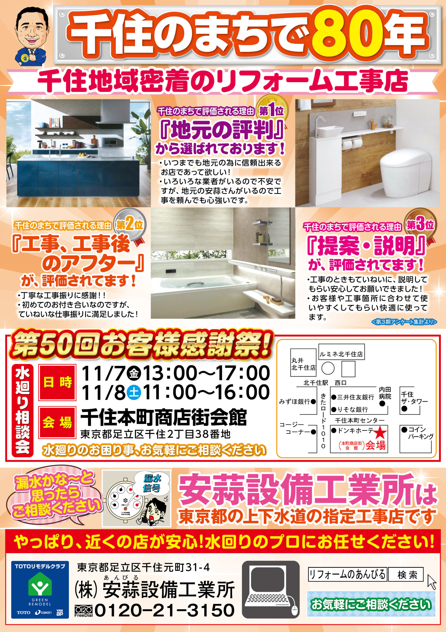 リフォームのあんびる(株式会社安蒜設備工業所)は、足立区千住元町にある、水廻り・内装・外壁・玄関・窓・マンションなどを得意とするリフォーム専門店です。 なにかご相談がありましたら、お気軽にメールまたはお電話でお問合せください。